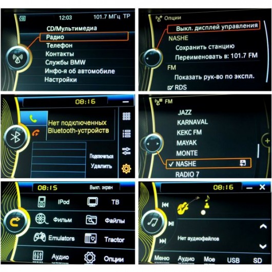 Устройство создано с учетом специфики BMW. Предусмотрено абсолютно все: и интерьер автомобиля, и цвет панели, и даже подсветка кнопок! Воспроизводит модель практически все ныне известные видео- и аудиоформаты: MP3, WMA, WAVE, MPEG1/2, MPEG4, WMV, JPEG, GIF, PNG, BMP, MS-Word, Excel, PowerPoint, Adobe PDF, *.txt. Кроме того, Вы можете просматривать текстовые документы и файлы в PDF-формате.