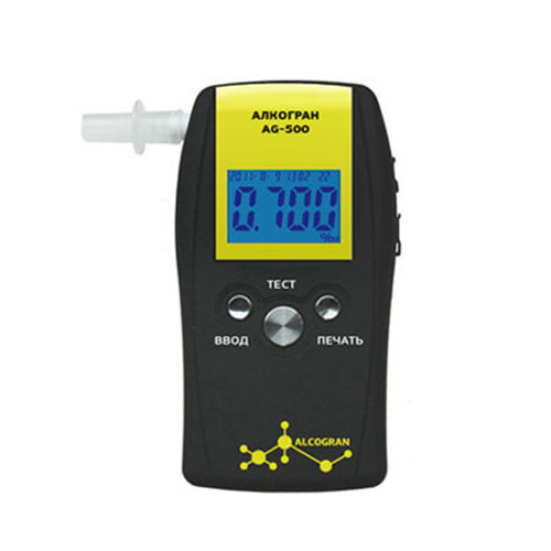 Алкотестер Алкогран AG-500 — это высокоточный надежный алкометр, который может подключаться к принтеру. Данная модель оснащена профессиональным электрохимическим датчиком, поэтому точность у нее очень высокая. Что и говорить, если такой же сенсор стоит у многих профессиональных алкотестеров, типа приборов ГИБДД.