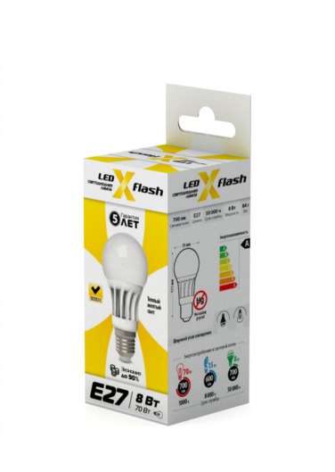 Cветодиодная лампочка X-Flash отличается рекордным сроком службы — 50 тысяч часов (около 20 лет при работе по 8 часов в сутки). Это значит, что X-Flash прослужит вам в 50 раз дольше, чем обычная лампа накаливания и в 6 раз дольше, чем компактная люминесцентная лампа!