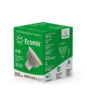Светодиодная лампа Ecomir GU5.3 4W эквивалентна галогеновой лампе мощностью 30 Вт с цоколем MR16. Потребляемая мощность – всего 4 Вт, цветовая температура – 3000 К (это желтый свет). Световой поток — 300 лм. Напряжение — 220 В. Матовый рассеиватель. Угол освещения > 90°.