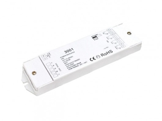 RGB усилитель 3001 в пластиковом корпусе позволит вдвое "разгрузить" RGB контроллер. Т.е. если мощность необходимого метража ленты превышает допустимую мощность контроллера, то к нему можно подключить усилитель. Таким образом, вы можете подсоединить до 20 метров дополнительной светодиодной ленты.