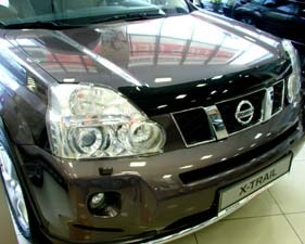 Дефлектор капота для Nissan X-Trail — это щиток из орг.стекла темного цвета, который крепится на переднюю часть капота. Благодаря тому, что дефлектор разработан специально для Nissan X-Trail от 2007 г.в., устанавливается он легко и быстро, при этом сверлить кузов вам не нужно. По форме же накладка полностью повторяет контуры капота. Данная модель прочна и долговечна: она надежно крепится, не боится коррозии, экстремальных температур и серьезных перегрузок.