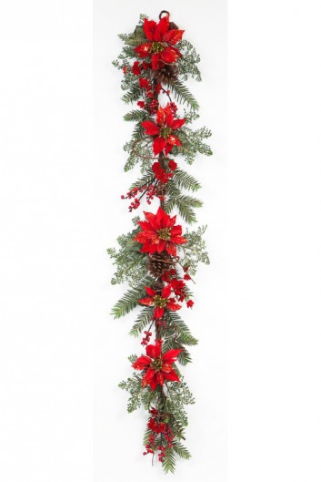 Новогодняя гирлянда с красными пуансеттиями создаст неповторимое рождественское настроение в вашем доме или офисе. Елочная гирлянда длиной 1,52 м украшена ярко-красными пуансеттиями — этот потрясающе красивый цветок, известный также под названием "рождественская звезда", стал во всем мире символом Рождества. В Европе пуансеттия уже стала неотъемлемой частью рождественских праздников.