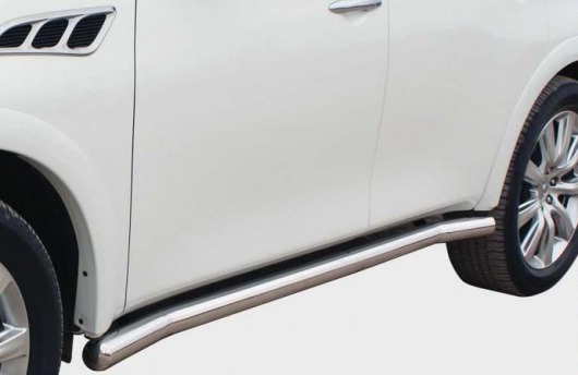Пороги на Infiniti QX 56 – это боковые подножки из нержавеющей стали диаметром 76 мм, которые позволяют более комфортно входить и выходить из салона автомобиля. Подножки Infiniti QX 56 очень прочные, надежные и долговечные: они не боятся коррозии, сколов и царапин и выдерживают большие нагрузки.