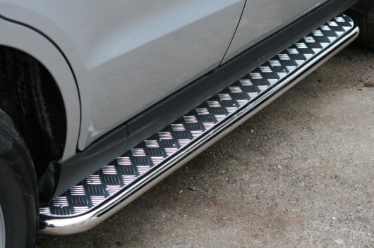 Боковые пороги-подножки сделаны специально для автомобилей Hyundai ix35 от 2010 г.в., поэтому устанавливаются достаточно просто и без повреждений корпуса. Помимо этого, стальные пороги с листом для Хендай ix35 смотрятся очень стильно и эффектно. Они добавят вашему авто еще больше солидности и внушительности.