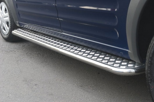 Пороги на Ford Connect – это боковые подножки из нержавеющей стали диаметром 42 мм, которые позволяют более комфортно входить и выходить из салона автомобиля. Подножки Ford Connect очень прочные, надежные и долговечные: они не боятся коррозии, сколов и царапин и выдерживают большие нагрузки.