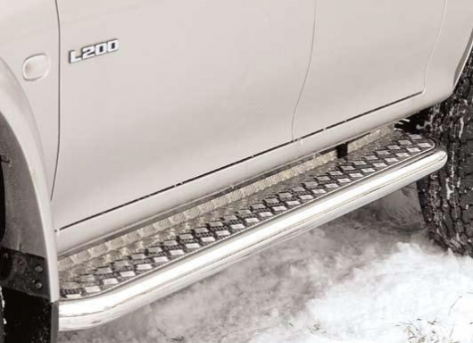 Боковые пороги-подножки сделаны специально для автомобилей Mitsubishi L200, поэтому устанавливаются достаточно просто и без повреждений корпуса. Помимо этого, стальные пороги с листом для Митсубиси L200 смотрятся очень стильно и эффектно. Они добавят вашему авто еще больше солидности и внушительности.