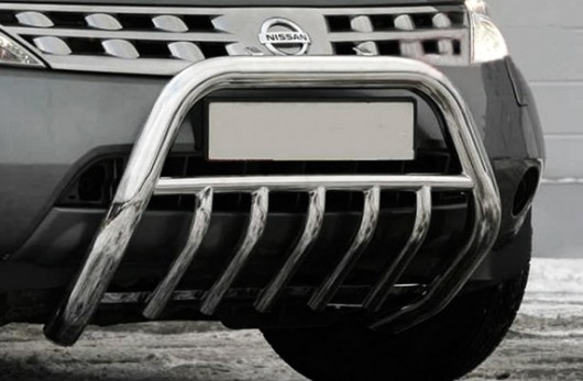 Передняя решетка Nissan Murano (кенгурятник) – это защитная дуга на бампер из нержавеющей стали диаметром 76 мм.