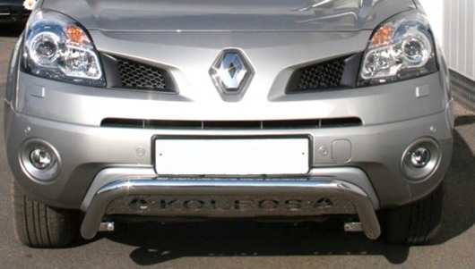 Защитная решетка переднего бампера с декоративной накладкой предназначена для автомобилей Renault Koleos 2008-2012 г.в. Вам не придется подгонять передний кенгурятник под размеры кузова вашего авто. И с монтажом проблем не возникнет: установка кенгурятника Renault Koleos производится в штатные отверстия, а значит, необходимость сверлить кузов отпадает.