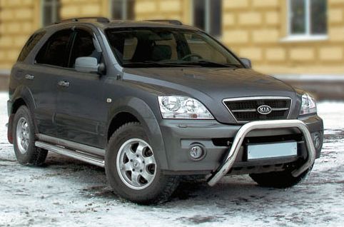 Защитная решетка переднего бампера предназначена для автомобилей Kia Sorento 2002-2006 г.в. Вам не придется подгонять передний кенгурятник под размеры кузова вашего авто. И с монтажом проблем не возникнет: установка кенгурятника Kia Sorento производится в штатные отверстия, а значит, необходимость сверлить кузов отпадает.