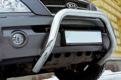 Передняя решетка Kia Sorento (кенгурятник) – это защитная дуга на бампер из нержавеющей стали диаметром 76 мм.