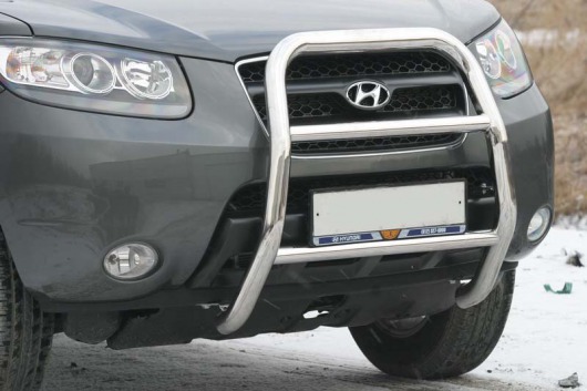 Защитная решетка переднего бампера предназначена для автомобилей Hyundai Santa Fe от 2006 г.в. Вам не придется подгонять передний кенгурятник под размеры кузова вашего авто. И с монтажом проблем не возникнет: установка кенгурятника Hyundai Santa Fe производится в штатные отверстия, а значит, необходимость сверлить кузов отпадает.