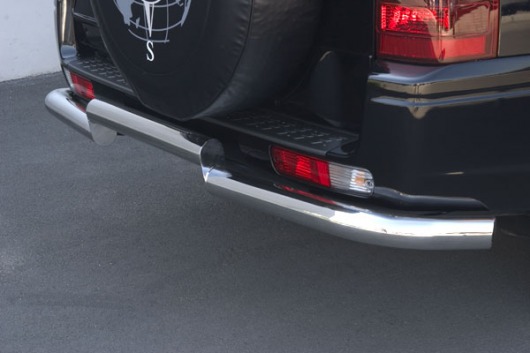 Защита заднего бампера для Mitsubishi Pajero III – это двойная труба на бампер из нержавеющей стали диаметром 76/76 мм.