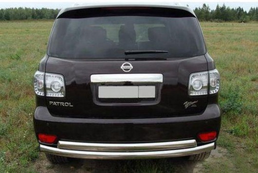 Защита заднего бампера труба предназначена для автомобилей Nissan Patrol от 2010 г.в. Вам не придется подгонять защиту под размеры бампера вашего авто. И с монтажом проблем не возникнет: установка защиты заднего бампера производится в штатные отверстия, а значит, необходимость сверлить кузов отпадает.