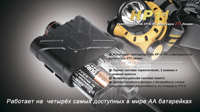 На минимальной мощности налобный фонарь на аккумуляторах проработает не менее 400 часов! Это огромный показатель даже для лучших моделей налобников. При этом питается налобный фонарь Fenix HP11 от четырёх самых популярных в мире батареек — «пальчиков» АА, или от аналогичных аккумуляторов.
