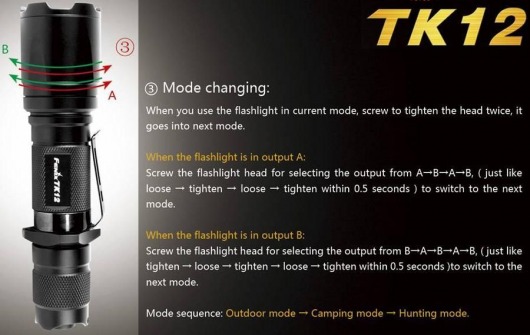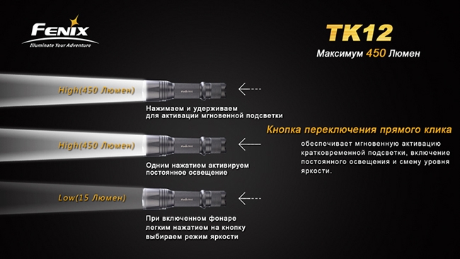 Управление фонарём Fenix TK12 очень просто. Удобная тактическая кнопка располагается в хвосте фонаря. Если нажать кнопку коротко, фонарь включится, если подержать её около 1 секунды — включится режим моментальной подсветки. Лёгкие нажатия на кнопку после включения приводят к смене режимов яркости.