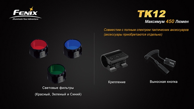 Для комфортного использования ТК12 в качестве тактического фонаря модель сделана совместимой с полным спектром аксессуаров — световых фильтров, выносной тактической кнопки, креплений под ствол. Небольшие размеры, высокая прочность и надёжность, агрессивный дизайн также делают фонарь одним из лучших в нише подствольных тактических фонарей.