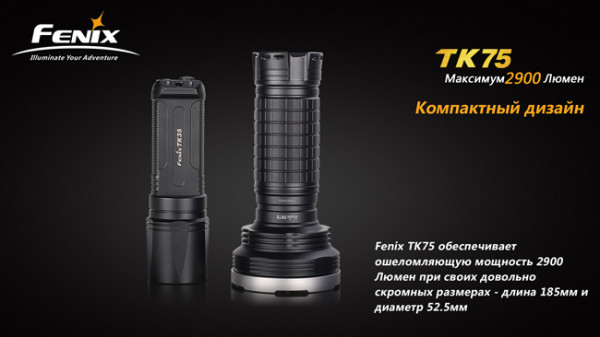 Сверхмощный поисковый фонарь Fenix TK75 Cree3 х XM-L2 LED очень похож на оригинальную модель TK75 3 х XM-L, но отличается от неё типом светодиодов. Новые диоды обеспечивают фонарю ещё большую мощность, чем у предшественника — 2900 люмен против 2600. Фонарь с отличными характеристиками очень востребован у поисковиков, в береговой охране, а также у любителей экстремального отдыха.
