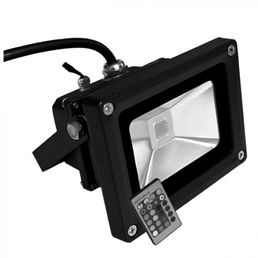 Led rgb прожектор имеет в комплекте пульт ДУ с литиевой батарейкой, с помощью которого можно регулировать яркость свечения и режимы (постоянное свечение, плавная смена цветов, стробоскоп). Радиус действия — 6 метров. Это облегчает пользование прожектором в местах с ограниченным или затрудненным обслуживанием.
