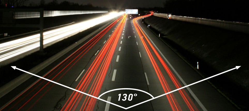 • Широкий угол обзора. Автомобильный регистратор с углом обзора 130° охватывает 5 дорожных полос. При этом он не искажает картинку, как большинство широкоугольных видеорегистраторов.