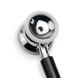 • Легкая и прочная металлическая 2-сторонняя головка с маленькой мембраной (20 мм) и открытым маленьким колоколом (18 мм). Переключаться между колоколом и мембраной очень просто: достаточно повернуть акустическую головку на 180° относительно стержневого клапана.