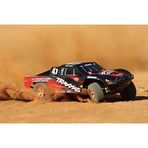 Радиоуправляемый внедорожник Traxxas Slash (TQ) - TRX58034 имеет задний привод. Машина на пульте управления оснащена мощным электродвигателем Тraxxas Titan 550 12T, регулятором оборотов Traxxas XL-5 и емким аккумулятором NI-MH 8.4v 3000mAh. Это позволяет авто разогнаться до 50 км/ч. Кроме того, дизайн кузова радиоуправляемого грузовика в точности повторяет оформление реальных автомобилей, участвующих в гонках.