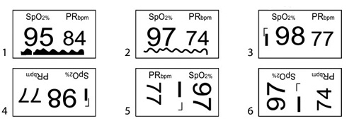 • Отображает показания в 6-ти режимах в зависимости от ориентации в пространстве. Переключая при помощи клавиши эти режимы, информация может отображаться в портретном или ландшафтном виде с включенной или выключенной пульсовой гистограммой. Кроме того, в приборе предусмотрена регулировка яркости. Таким образом, 6 режимов отображения информации на дисплее позволяют подстроить прибор для максимального удобства работы.