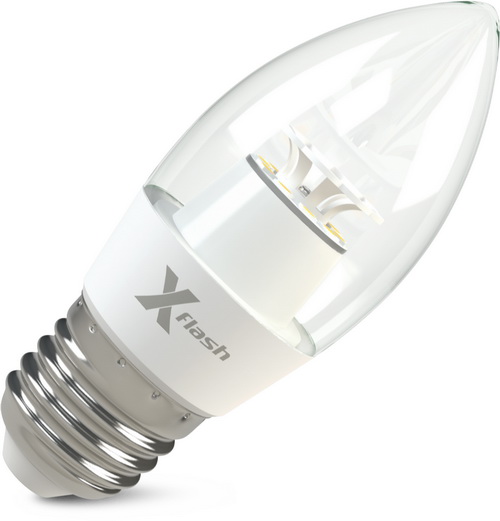Светодиодная лампа X-Flash CandleE27 используется для общего и декоративного освещения. Колба лампы прозрачная, выполнена в виде пламени свечи. Лампа соответствует по форме, цоколю и размерам аналогичным компактным люминесцентным лампам и лампам накаливания. Может применяться в любых светильниках с цоколем типа «миньон». Данная модель рассчитана на напряжение 220 В. Мощность диодной лампы X-Flash — 6,5 Вт., яркость —500Лм, угол освещения лампы более 270 градусов, а температура свечения – 3000 K (это желтый свет).