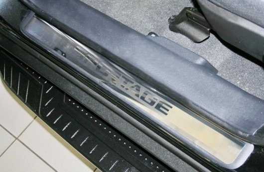 Внутренняя накладка на порог Kia Sportage II — это аксессуар автомобильного тюнинга, который защищает внутренний порог от механических повреждений при посадке и высадке из машины. Декоративные накладки с рисунком на внутренние пороги предназначены для автомобилей Kia Sportage II от 2008 г.в.