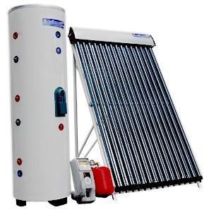 Принцип действия: коллектор поглощает солнечную энергию и передает ее в бак-аккумулятор посредством принудительной циркуляции теплоносителя в солнечном контуре. В системах с принудительной циркуляцией в коллекторный контур включается циркуляционный насос, что дает возможность устанавливать водобак-аккумулятор в любой части здания. Направление движения теплоносителя должно совпадать с направлением естественной циркуляции в коллекторах. Включение и выключение насоса производится электронным блоком управления, представляющим собой дифференциальное управляющее реле, сравнивающего показания датчиков температуры, установленных на выходе из коллекторов и в баке. Насос включается, если температура в коллекторах выше температуры воды в баке