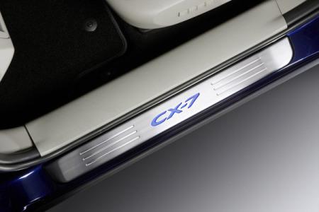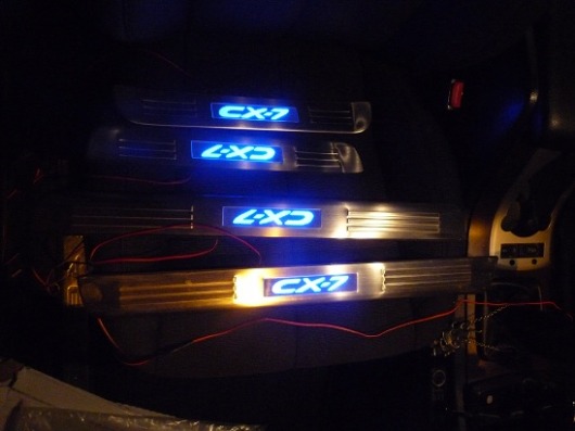 Светящиеся накладки на пороги Mazda CX-7 не входят ни в одну комплектацию этой модели автомобиля. Они органично впишутся в интерьер вашего автомобиля, дополняя светящиеся элементы панели управления, и позволят вам сделать свой автомобиль еще более оригинальным и стильным. Каждое открытие двери будет сопровождаться теплым синим светом. Кроме того, накладки оснащены специальными полосками, которые обеспечивают плотное соприкосновение ноги и порога.