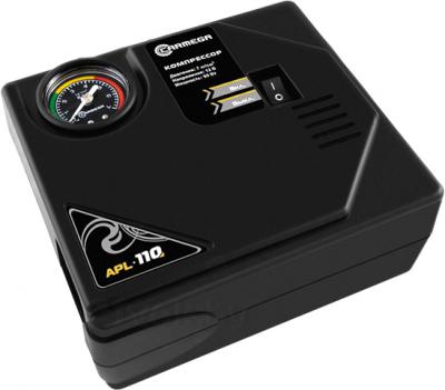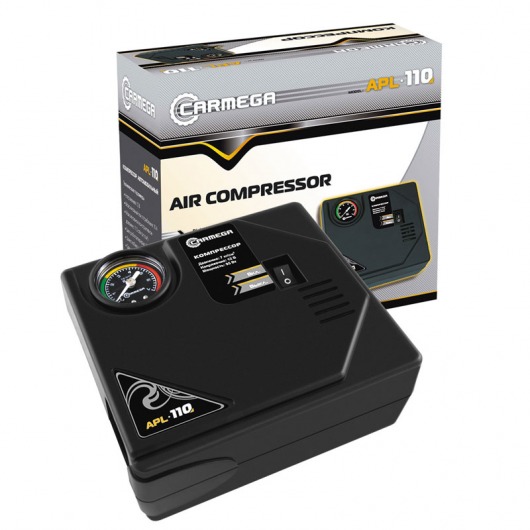 Специальное термореле защищает двигатель от перегрева — поршневой компрессор Carmega APL-11 автоматически выключится при нагреве свыше +85 °С. Корпус прибора снабжен манометром для контроля процесса накачивания, питание Carmega APL-110 получает через гнездо прикуривателя.