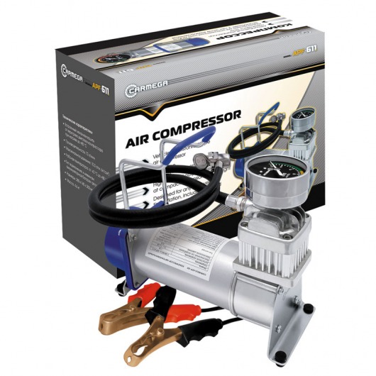 Поршневой автомобильный компрессор Carmega APF-611 обладает весьма внушительными показателями производительности (72 л/мин.), а также временем непрерывной работы — 40 минут. Поэтому, создавая максимально давление в 10,5 атм., автокомпрессор Carmega APF-611 может накачивать шины автомобилей любого типа, в том числе больших внедорожников и грузового транспорта. Кроме того, эта модель универсальна и с помощью набора из 3 переходников вы можете накачать велосипедные шины, резиновые лодки, матрацы, детские надувные игрушки, спортивные мячи.