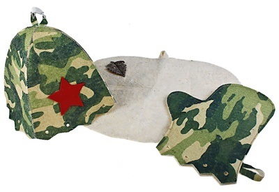 В набор банных принадлежностей входит специальная рукавичка, которая поможет очистить поры вашего тела от грязи и шлаков, а также улучшит кровообращение во всем теле, что окажет благоприятное воздействие на весь организм в целом. Кроме того, в набор входит мягкий удобный коврик, которым застилают лежанку. Таким образом, купив банный набор «Комуфляж» вы сделаете свои походы в баню более комфортными.