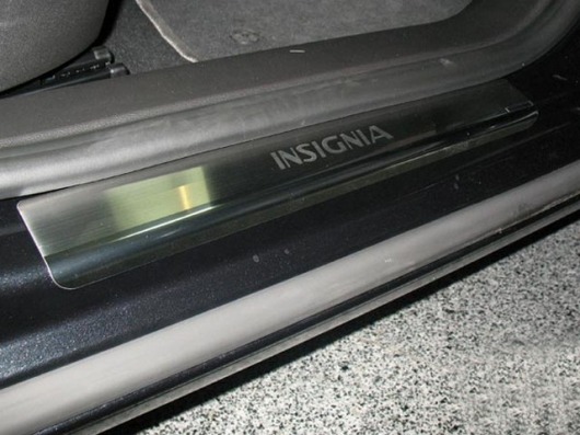Внутренняя накладка на порог Opel Insignia  — это аксессуар автомобильного тюнинга, который защищает внутренний порог от механических повреждений при посадке и высадке из машины. Декоративные накладки с рисунком на внутренние пороги предназначены для автомобилей Opel Insignia от 2009 г.в.