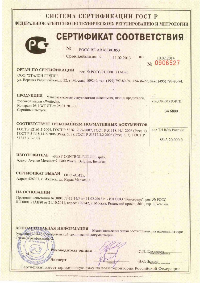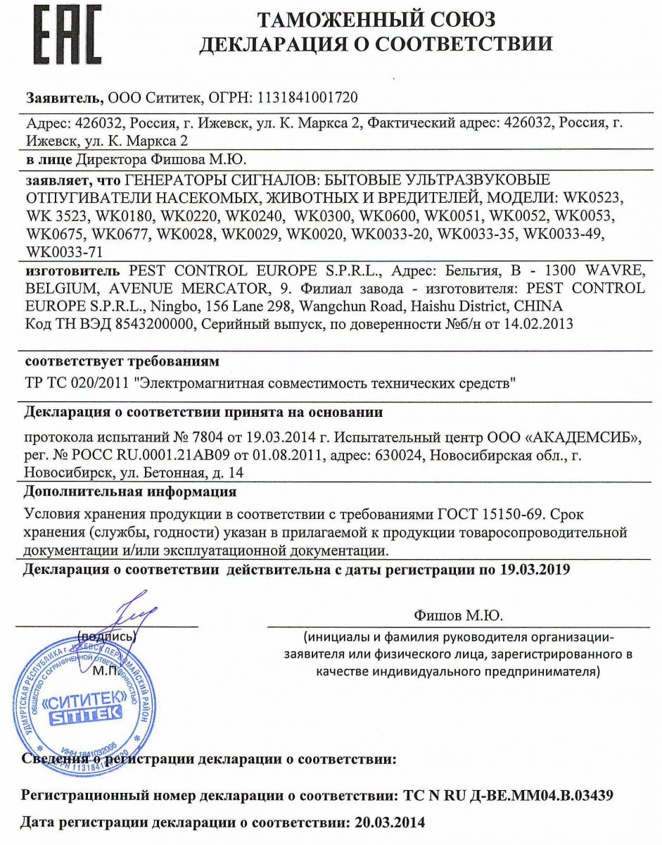 Ультразвуковой отпугиватель собак и диких животных Weitech WK0052 сертифицирован и соответствует требованиям Таможенного союза