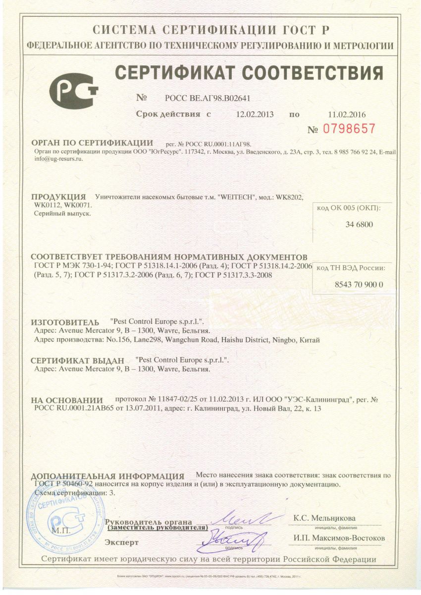 Weitech WK 8202 — компактный уничтожитель комаров, подключаемый к розетке. Он приманивает кровососущих насекомых на площади до 20 кв.м. с помощью ультрафиолетового света и убивает электрическим микроразрядом. Кроме уничтожения насекомых, может выполнять функцию ночника, для чего использует светодиоды фиолетового свечения.