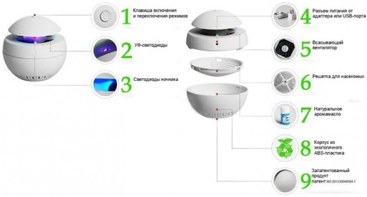 Aroma работает без шума и запаха. В своей работе ловушка не использует химических веществ, как многие классические уничтожители и отпугиватели (дымящиеся пластинки, аэрозоли, мази и т.п.), поэтому может применяться даже в близости от детей. Более того, излучаемый прибором свет может послужить в качестве ночника в детской комнате.