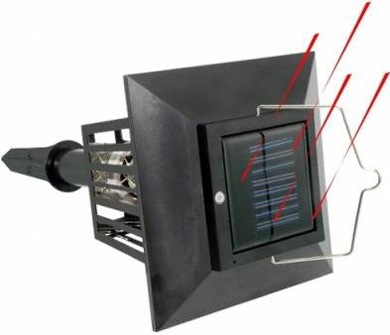 Уничтожитель комаров и кровососущих насекомых Садовый приманивает их светом УФ-ламп и убивает разрядом тока. Кроме уничтожения насекомых, может выполнять функцию садового фонаря, в форме которого он выполнен. Работает полностью автономно от 2-х встроенных аккумуляторов, заряжающихся от солнечной панели на верхней стороне уничтожителя.