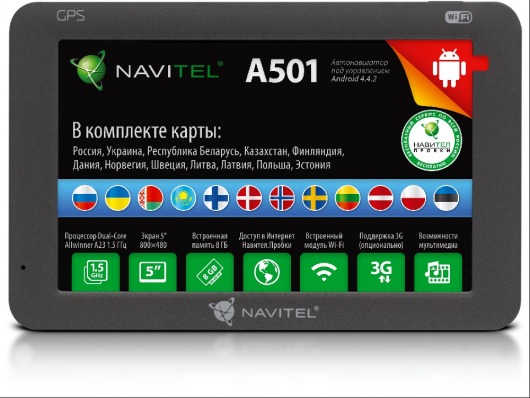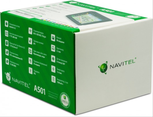 Портативный автомобильный gps навигатор Navitel A 501 имеет емкостный 5-дюймовый экран,  поддерживает навигационное программное обеспечение — Навител 9.2 и предустановленные карты России, Украины, Республики Беларусь, Казахстана, Финляндии и других стран Европы.