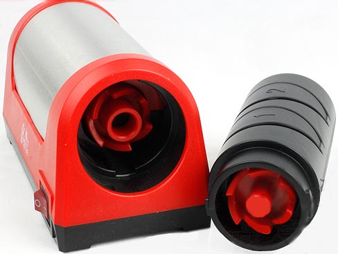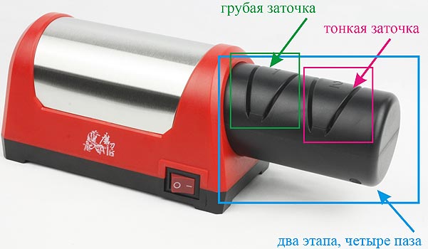 Специальные направляющие располагаются под точно рассчитанными углами к дискам, что гарантирует профессиональное качество работы. На корпусе расположена кнопка включения/выключения. Конструкция ножеточки продумана таким образом, что пользоваться устройством сможет абсолютно каждый, даже новичок. При этом станок для заточки ножей легко разбирается и чистится.