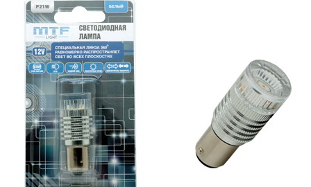 Светодиодная лампа MTF P21W оснащена специальной линзой 360°. Благодаря этому свет распространяется равномерно и полностью освещает площадь отражателя, расположенную у основания лампы