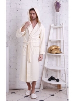 Халат с капюшоном из махровой ткани средней плотности. Отлично впитывает влагу, легко стирается.