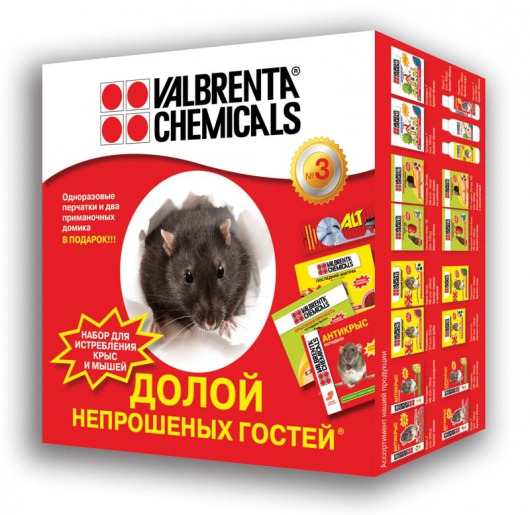 Набор №3 VALBRENTA CHEMICALS "Долой непрошенных гостей" предназначен для комплексного истребления всех видов крыс и мышей в любых помещениях и на прилегающих к ним территориях. В наборе подобрано оптимальное сочетание нескольких видов приманок с различными возможностями использования и различными ароматами, которые так привлекают грызунов.