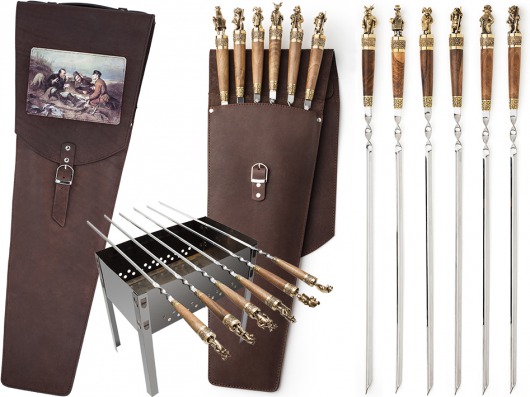 • Все шампуры хранятся в оригинальном чехле из натуральной кожи, который украшен репродукцией знаменитой картины Перова "Охотники на привале" и внешне напоминает колчан для стрел.