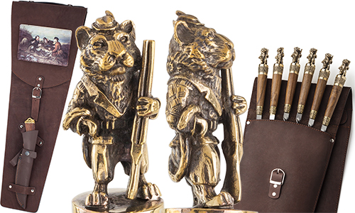 • Все шампуры хранятся в оригинальном чехле из натуральной кожи, который украшен репродукцией знаменитой картины Перова "Охотники на привале" и внешне напоминает колчан для стрел.