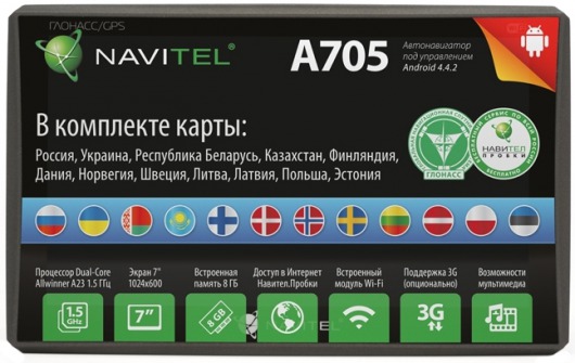 Автомобильный GPS навигатор Navitel A705 проложит оптимальный маршрут, заранее предупредит о поворотах, пробках или о зонах контроля скорости! Навигатор Navitel поддерживает систему ГЛОНАСС. Главное, что дает использование в навигаторе совместного сигнала GPS и ГЛОНАСС — это точность и надёжность. Ведь чем большее количество сигналов от спутников примет ваш навигатор, тем точнее будет определено ваше местоположение и меньше шансов потерять навигацию. Автомобильный навигатор поддерживает навигационное программное обеспечение Навител 9.3 и предустановленные карты России, Украины, Республики Беларусь, Казахстана, Финляндии, Дании, Норвегии, Швеции, Литвы, Латвии, Польши и Эстонии. Вам достаточно только указать конечный пункт!