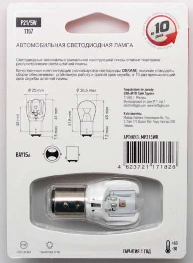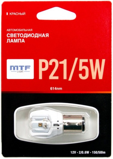 Светодиодная лампа MTF Light P21/5W 2/0.6W с уникальной конструкцией линзы отлично повторяет распространение света штатной лампы. Цвет свечения автолампы: красный.