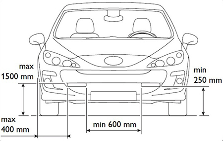 Стандарт установки - R87. Согласно ему LED-элементы должны занимать площадь от 25 до 200 кв.см и излучать свет силой от 400 до 800 кд. Во-вторых, ДХО должны быть установлены не ниже 250 и не выше 1500 мм. Минимальное расстояние между парой огней 600 мм, а от края не дальше 400 мм.