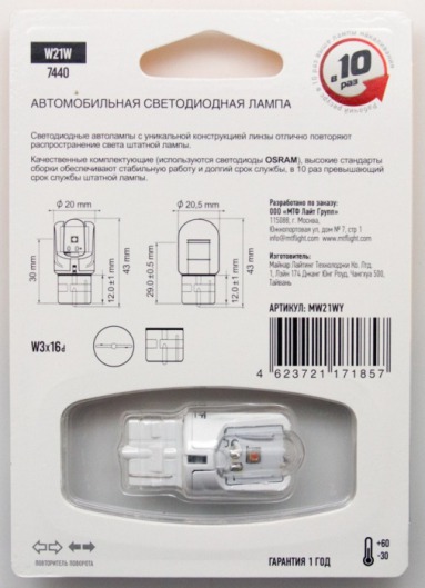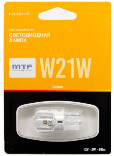 Светодиодная лампа MTF Light W21W 2W с уникальной конструкцией линзы отлично повторяет распространение света штатной лампы. Цвет свечения автолампы: желтый.